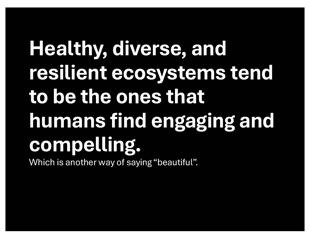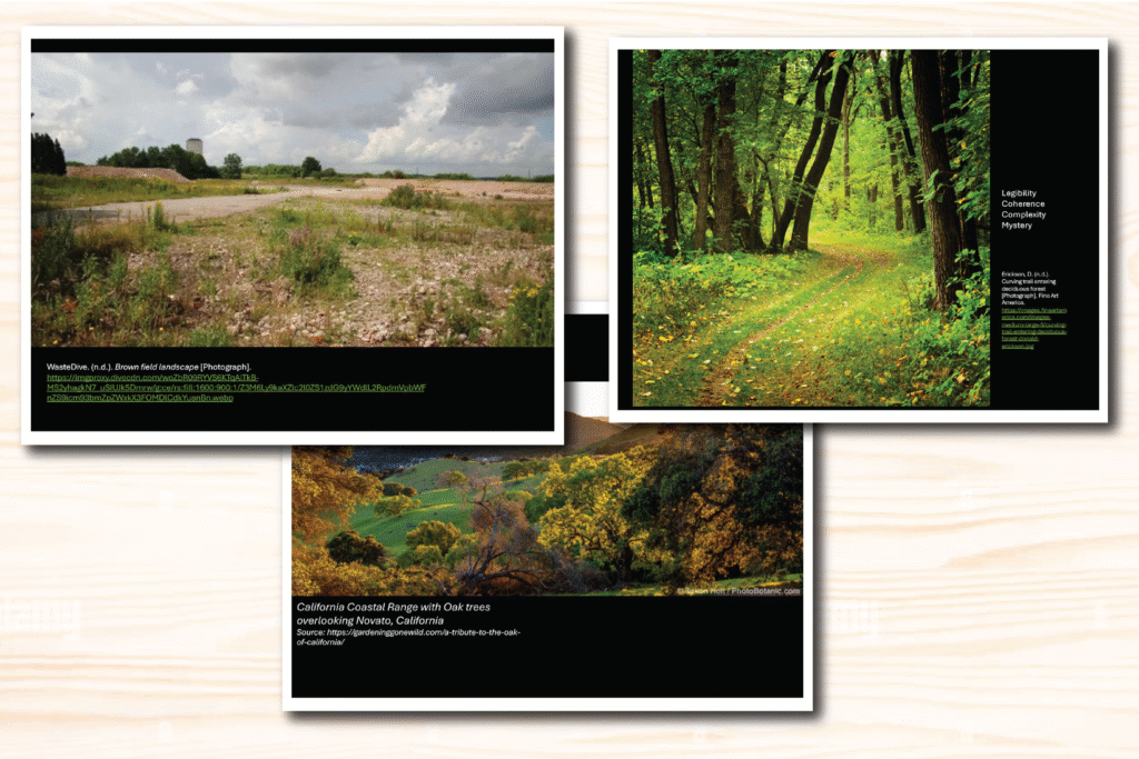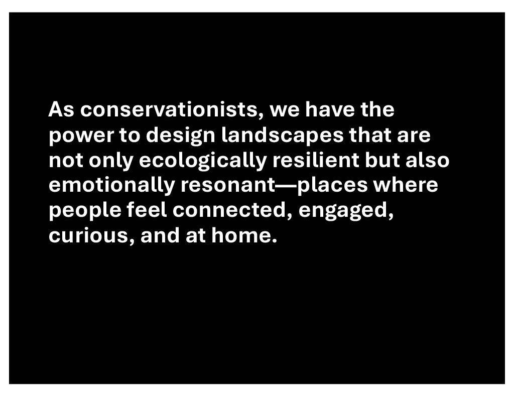 This presentation explored how the inner life, our emotional needs and perceptual tendencies, shape how we relate to landscapes, and how conservation professionals can draw on this understanding to inform their work to be part of ecological and beautiful landscapes and engage emotionally through presence. Using Kaplan’s Preference Matrix, Information Processing Theory, and Prospect–Refuge theory as frameworks for the learning experience, the talk invited participants to notice how aesthetic experience becomes a bridge between outer landscapes and our inner experience. The presentation was impactful. In post-presentation conversations, participants shared how this topic transformed their thinking about conservation and restoration, especially regarding how people will perceive it. This presentation was more academically aligned yet appropriate for the audience.